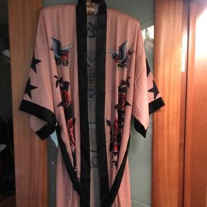 - Tauchen Sie ein in die Raffinesse unseres Kimonos. Er ist aus luxuriöser Kunstseide gefertigt und umhüllt Sie mit Komfort. Das bodenlange Gewand ist mit von Tattoos inspirierten Prints verziert. Diese Designelemente stehen in feinem Kontrast zu dem zarten Roséton. Zusammen bilden sie eine Ästhetik, die kühn ist und dennoch einen Hauch von Zerbrechlichkeit bewahrt.